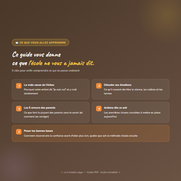 Ce guide est conçu pour les enfants de 8 à 15 ans. Les mécanismes de l'échec scolaire apparaissent souvent dès le primaire, et toutes les pistes d'action s'adaptent à l'âge de votre enfant.
