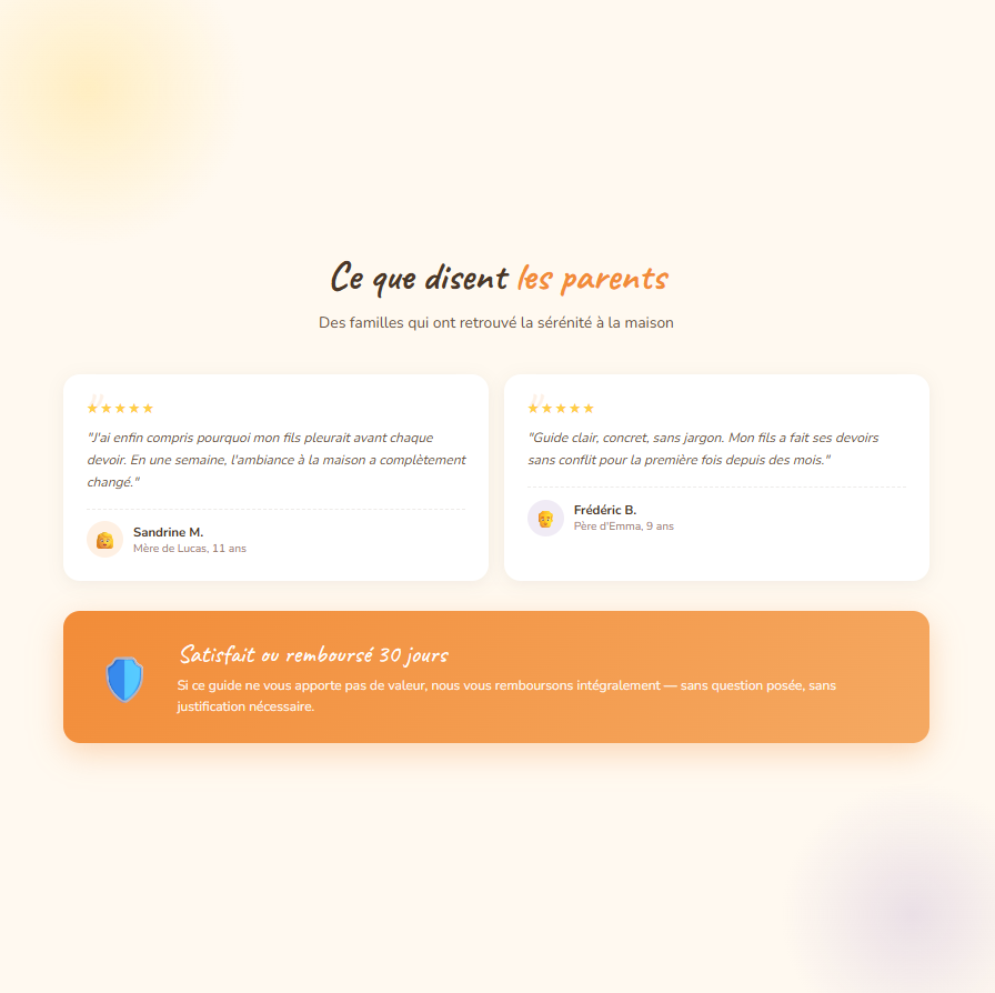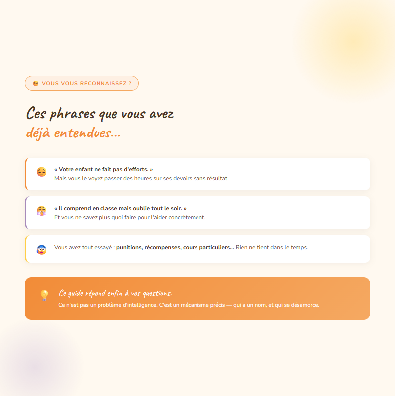 "J'ai enfin compris pourquoi mon fils pleurait avant chaque devoir. Ce n'était pas de la mauvaise volonté. En une semaine d'application, l'ambiance à la maison a complètement changé."